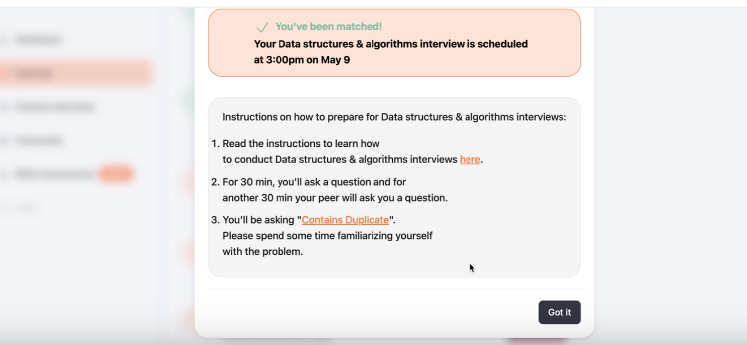 عند حجز المقابلة ومطابقتك مع مستخدم آخر، ستصلك إشعار بالمطابقة. عند فتحه، ستظهر لك نافذة تحتوي على تفاصيل المقابلة ووقتها، بالإضافة إلى أسئلة المقابلة حتى تتمكن من التدرب مسبقًا.-png.png?width=1502&height=695&name=Screenshot%20(24)-png.png)