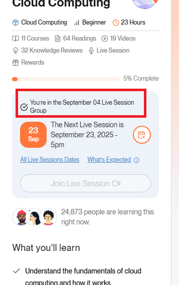 Check the live session you are enrolled in — displayed at the top-right corner (e.g., Sep 4th Group).
